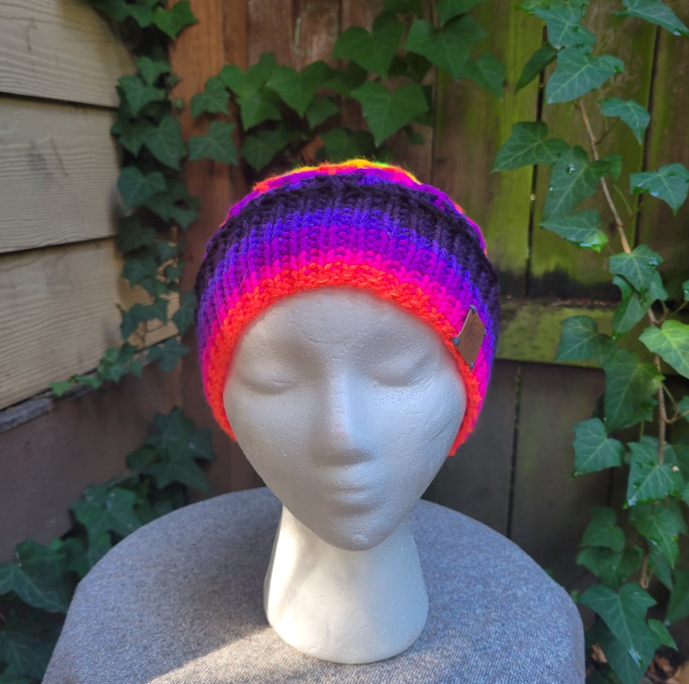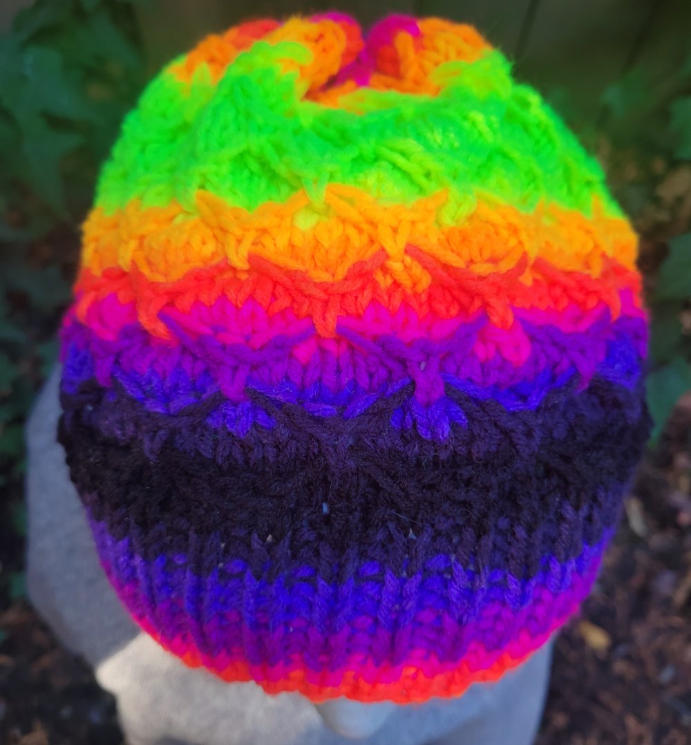 This neon mermaid stitch hat is medium-large sized and features my all-time favorite knitting stitch, the diamond honeycomb (which I lovingly call "the mermaid stitch"). This hat covers your ears, has a 100% leather Yarn Deity hat tag, and is made from 100% acrylic yarn.