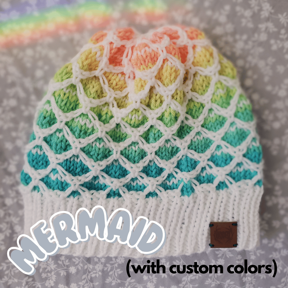 The "Two Colors/Custom" option mainly refers to picking two colors for the mermaid style where the part inside the criss-cross diamond stitches would be a different color than the main hat color/the criss-cross diamond stitches (like in the second photo with the white/rainbow hat). BUT if you'd like any of the styles with multiple colors, choose that option and email me at [email protected] with all your ideas or tell me in the "notes" section at checkout.